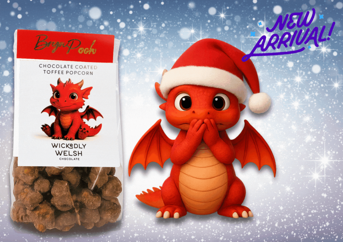 Mischievous little nuggets of joy from our baby Welsh Red Dragon, Bryn (Y Babi Draig Goch). Legend has it that baby dragons are rather tricky to potty train (no one makes dragon nappies, see), and when Bryn gets the giggles… well, magic happens. Each little chocolate-covered toffee popcorn “nugget” is a tiny taste of wonder, the sort you’ll want to share, but probably won’t. Pob lwc (good luck) saving any for later!